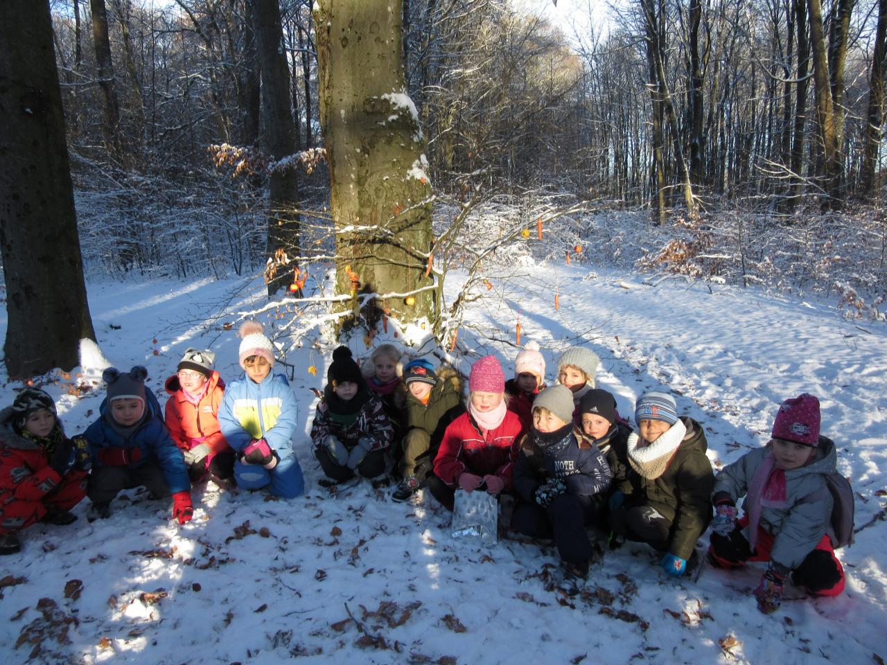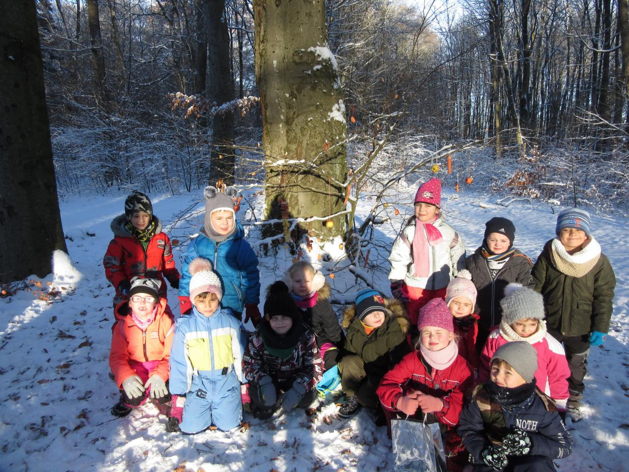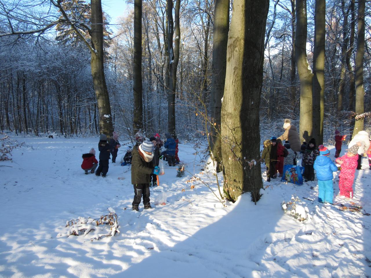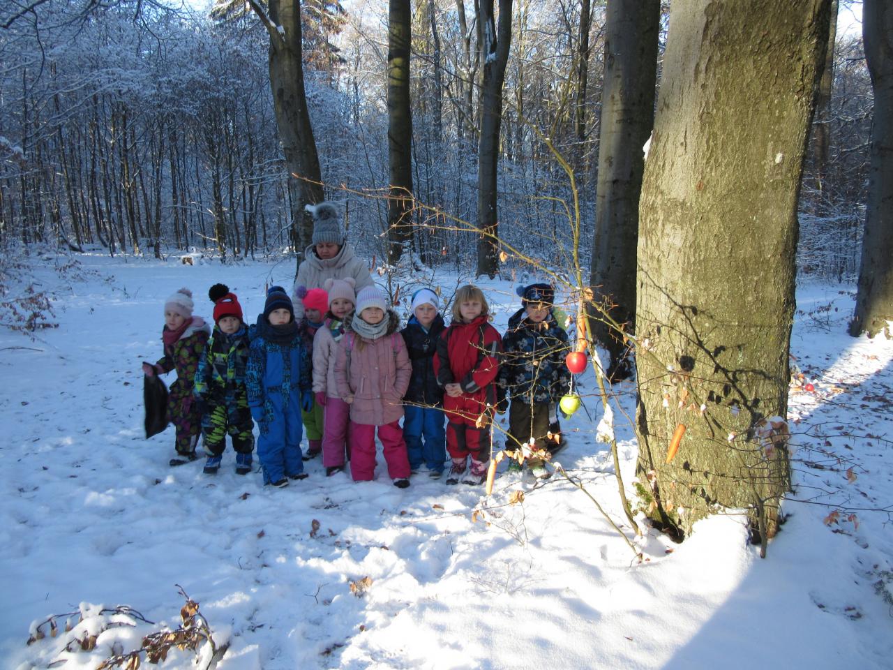 Děti si přinesly z domova ovoce, zeleninu i pečivo a společně jsme se vydali ozdobit několik stromečků. Před odchodem zpět do školky jsme nezapomněli zvířátkům zazpívat několik vánočních koled.