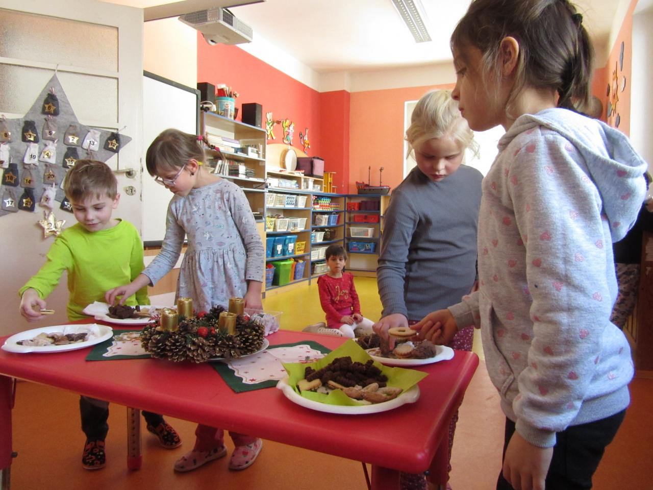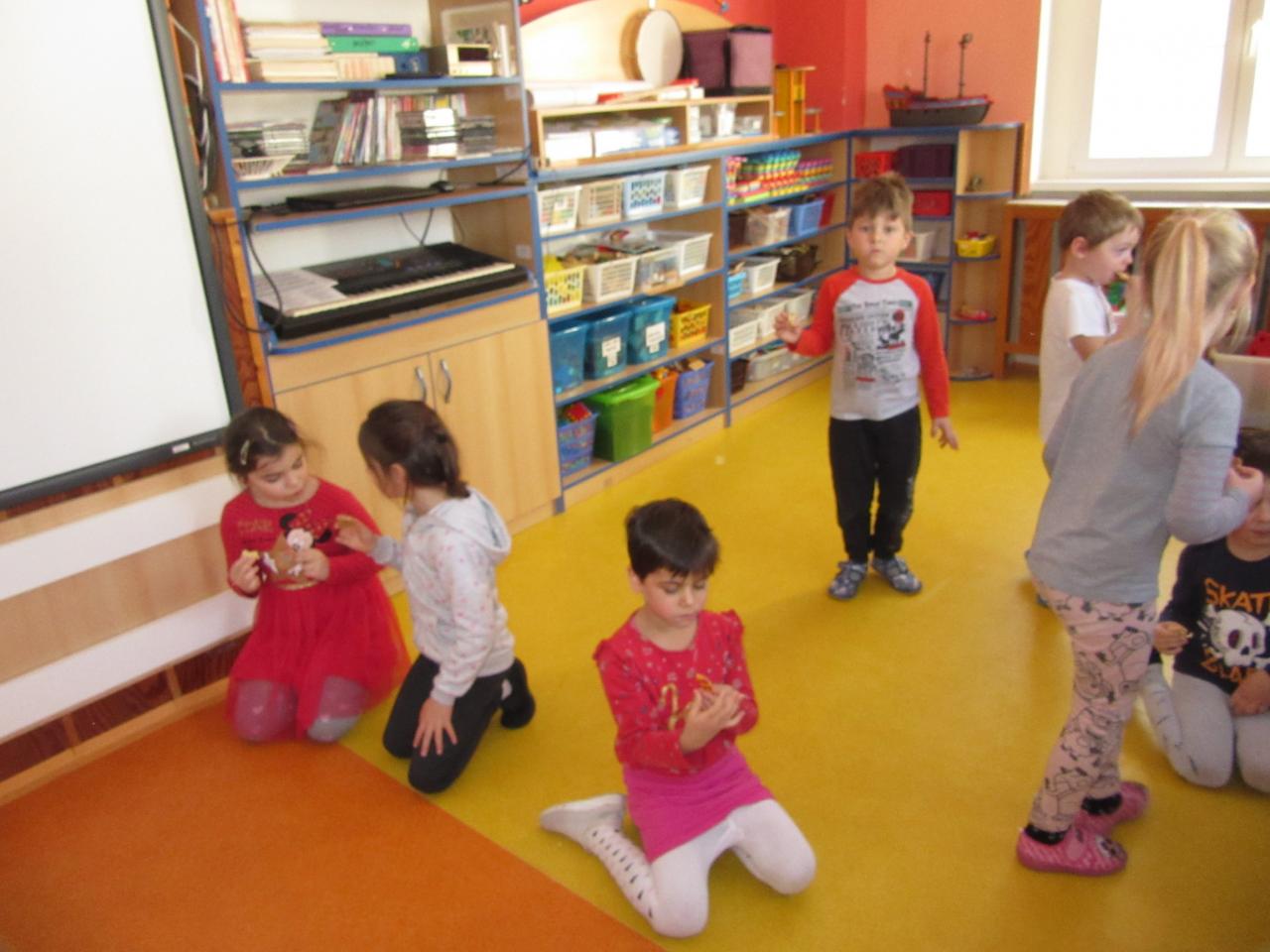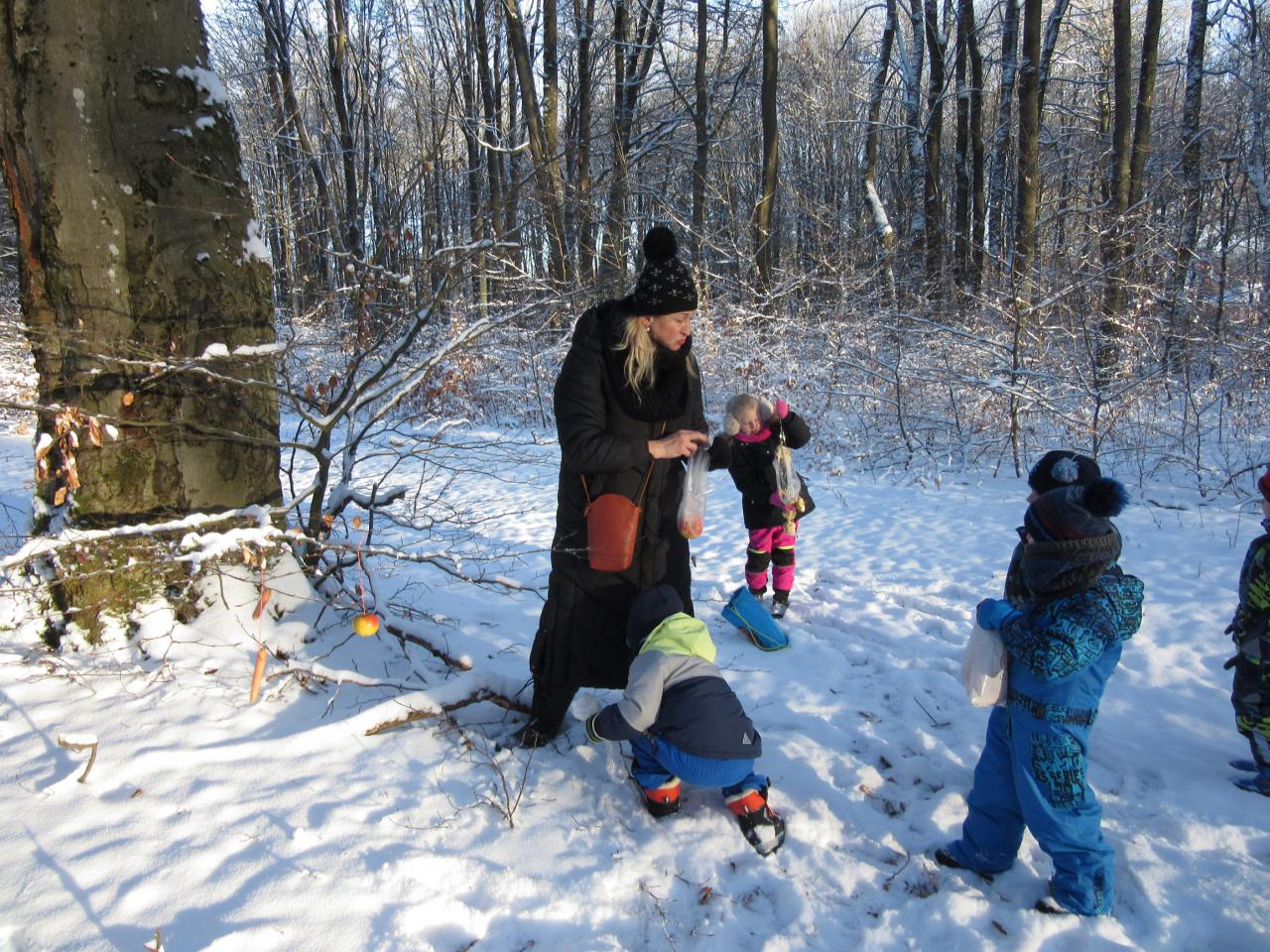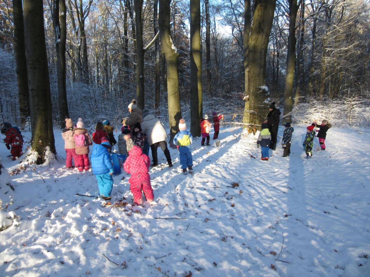 Děti si přinesly z domova ovoce, zeleninu i pečivo a společně jsme se vydali ozdobit několik stromečků. Před odchodem zpět do školky jsme nezapomněli zvířátkům zazpívat několik vánočních koled.