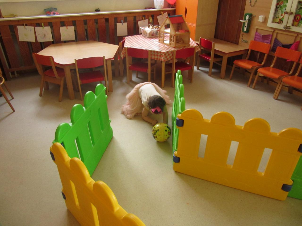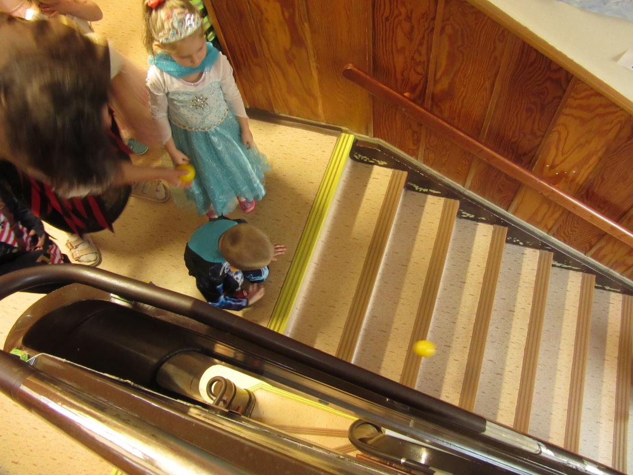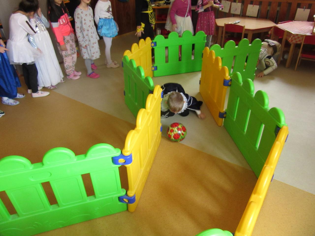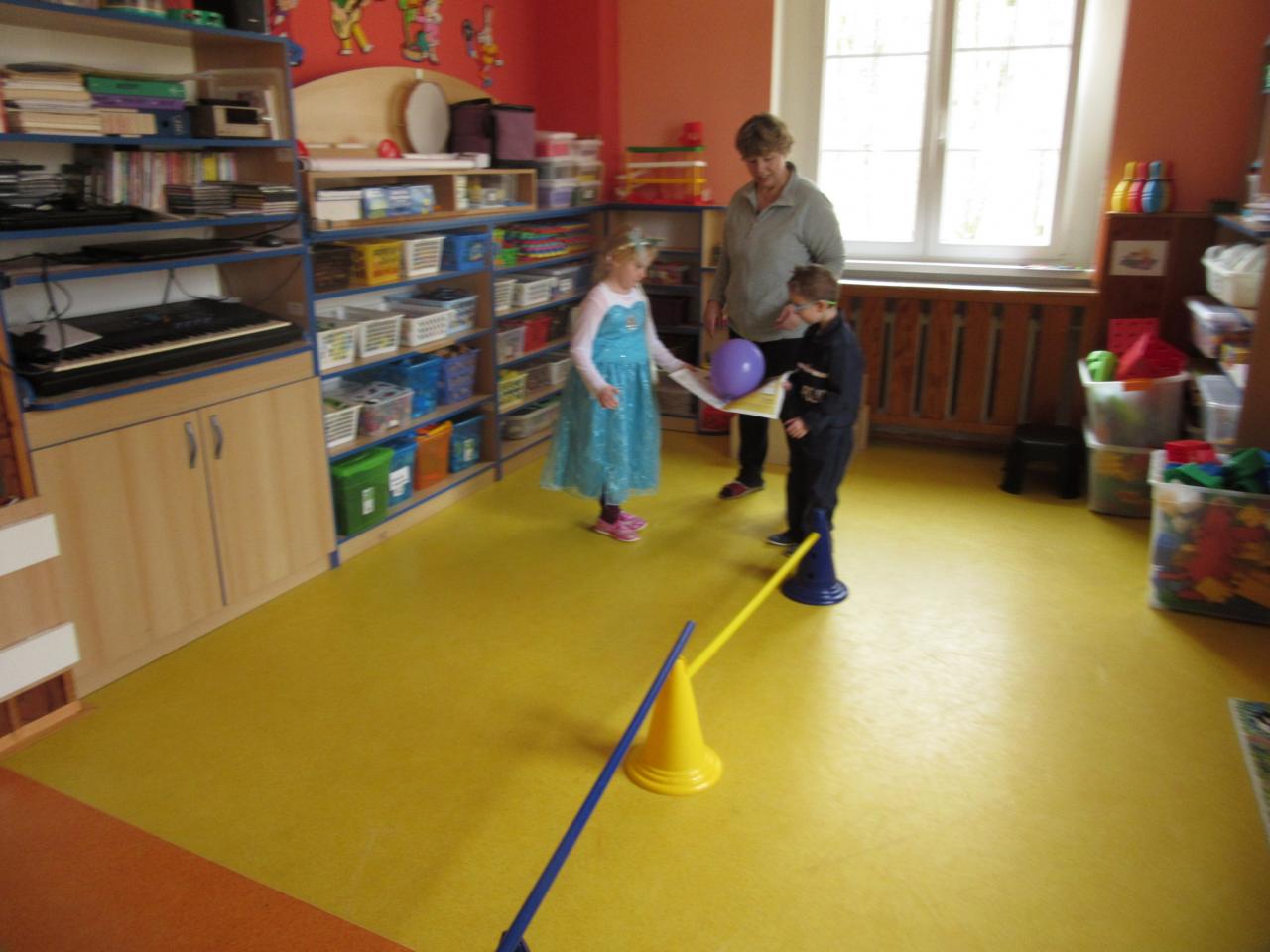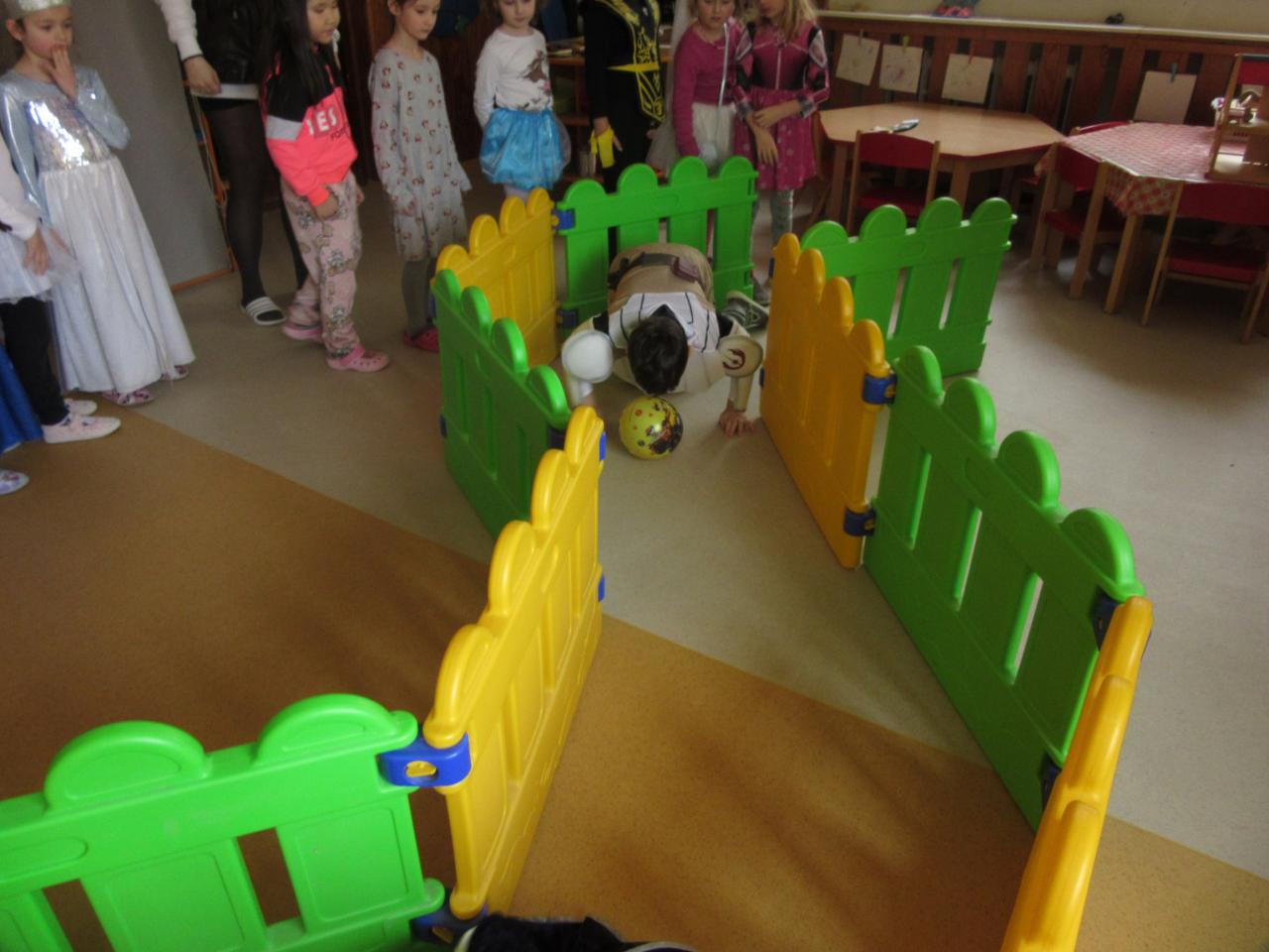 Následovali hry a soutěže s míčky. Míčky jsme různě přenášeli, vhazovali, strkali a kutáleli, třeba i ze schodů – při tom všem děti předvedly, jak jsou obratné a šikovné.